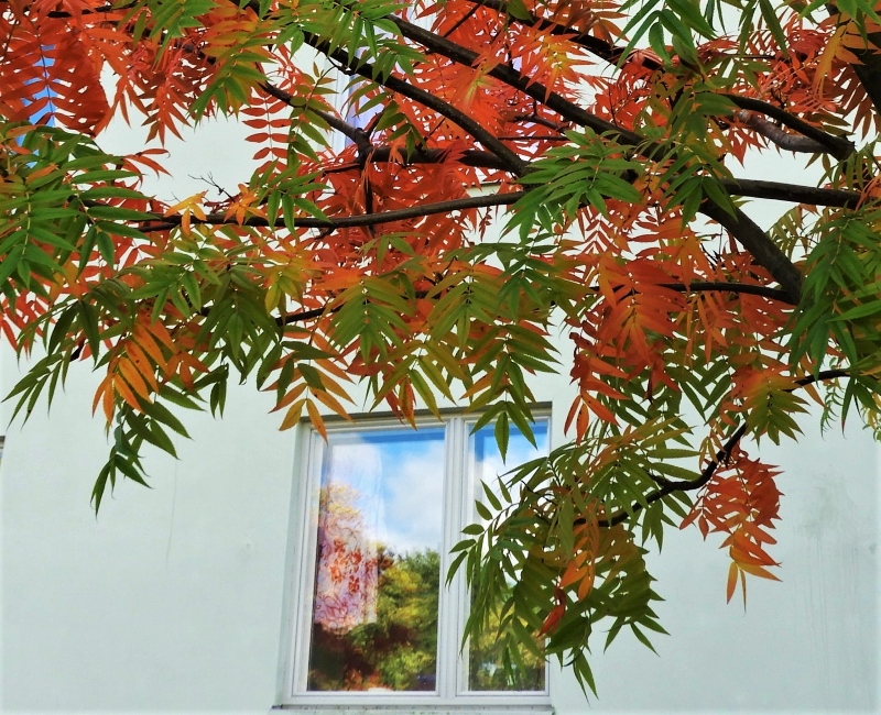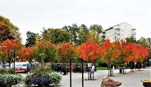 Ullungrönnarna som planterades för mer än sju år sedan på Hugo Sabels torg ökar lite i omfång för varje år. De har nästan inga bär i år och frosten har ännu inte färgat löven blodröda, men de börjar få färg.