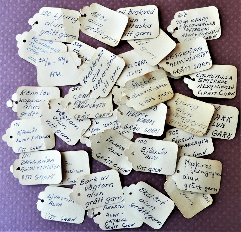 Där hittar jag i ett hörn de sparade etiketterna från växtfärgningskurs i maj 1971, jag stickade en tröja av proverna och den är nu utsliten och lappad. Det har gått 50 år sedan den vågen sköljde över oss. Varje etikett ett minne.