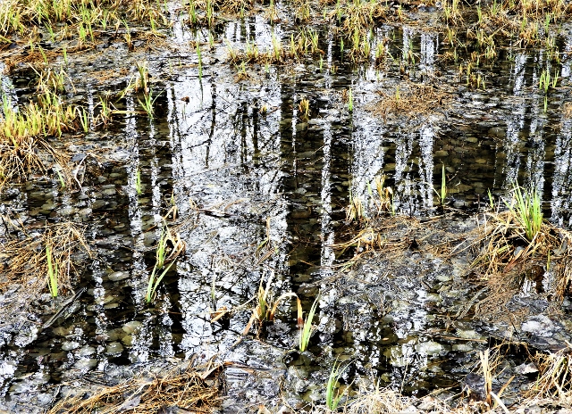 Lite grönt sticker upp ur vattnet, träsket är ogästvänligt och spången lutar lite, tänk om den tippar eller sjunker, hur kommer jag då tillbaks?