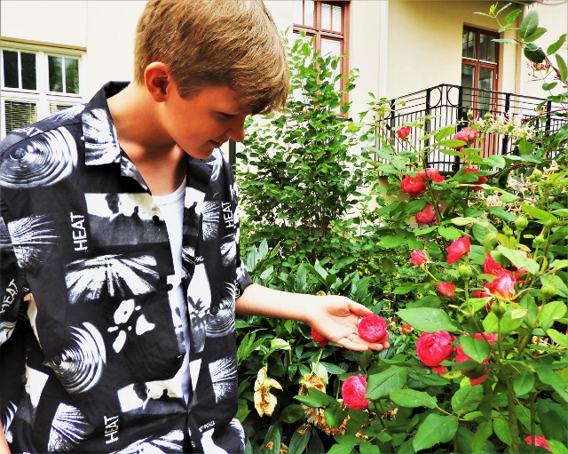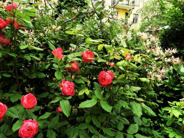 Rosor trivs, här blommar Benjamin Britten framför en doftande kaprifol