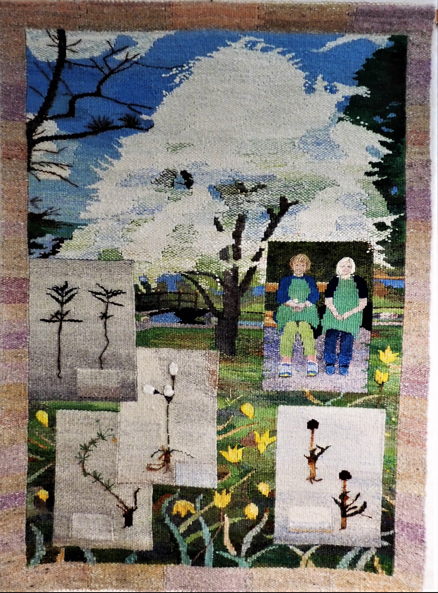 I stället för att gå ut i värmen som torkar gräsmattor till gråbeige och ger mig andnöd, sätter jag mig tillrätta i i vävstolen och lägger in gröna trådar i ett sommarbrev som Karin och barnen målade och skickade till mig för många år sedan. Den förra väven tog mig fyra år att göra färdig, den här blir enklare. Tror jag lovade att visa vad det blev av den förra och här är den. Jag har kallat den ”Vännerna” för enkelhetens skull och det var de Bergianska vännerna som satte fart på mig,