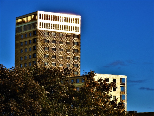 När solen vid fyratiden har börjat dala ger plåtarna överst på Drabanthuser bländande reflexer.