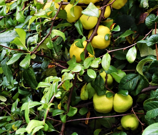 Rabatterna utmed gatan har flera buskar med rosenkvitten, de ger en god marmelad.