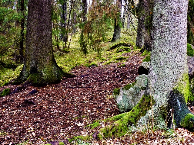 Tallar och granar med höga och grova stammar, en skog med äldre träd än de som står på rationellt skötta ”trädåkrar”. Där får de aldrig det här omfånget.