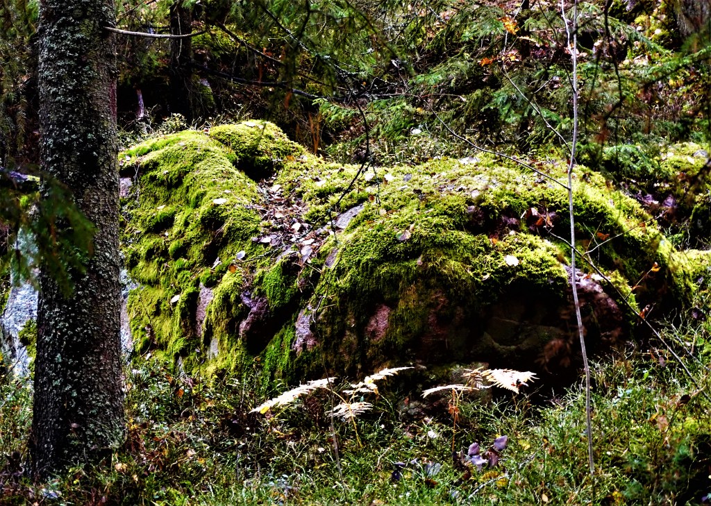 Efter regnet är hela skogen grön, mossorna sväller och lyser och har ”lånat av smaragderna sin färg”, Olof Thunmans gånglåt dyker upp ur minnet, när hörde jag eller gick efter den senast, minst 75 år sedan.