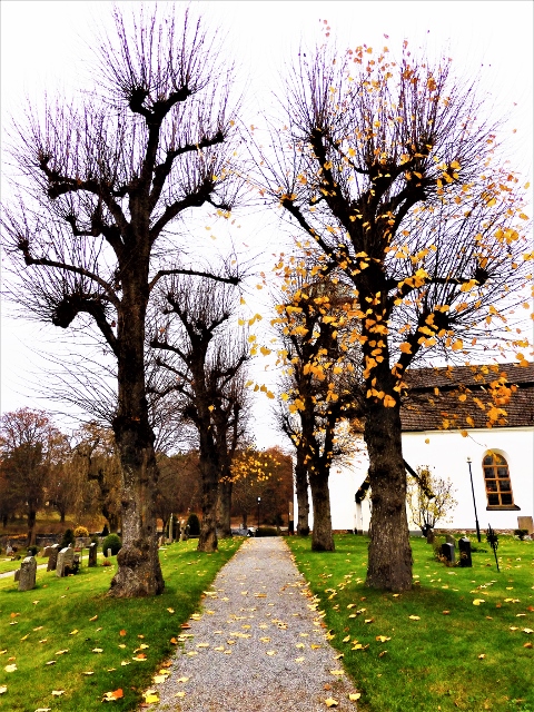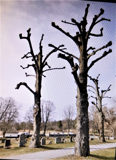Så här såg lindarna på Eds kyrkogård ut i april 2020 innan de nya löven spruckit ut, de hade stått och sett spökloka ut hela vintern innan, Sen glömde jag att kolla hur mycket löv de fick första året efter den häftiga klippningen.