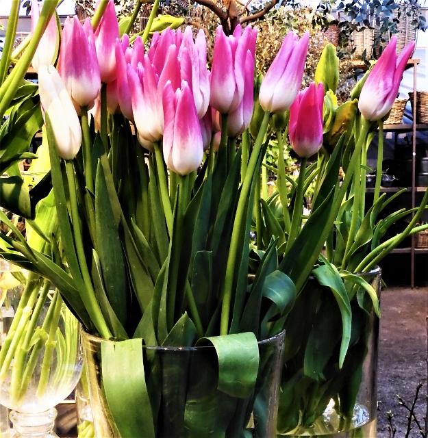 Högsäsong för tulpaner, så mycket folk och många bär en rektangulär kartong med några tulpaner i.