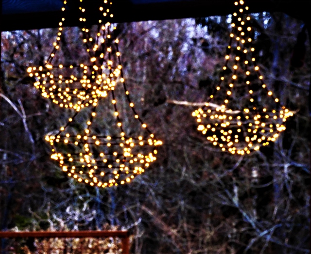 Vid utgången får jag syn på de små ljuskronorna av ljusslingor som hänger under taket över utomhuskassorna. Som hela trädgården, ljus i mörkret.