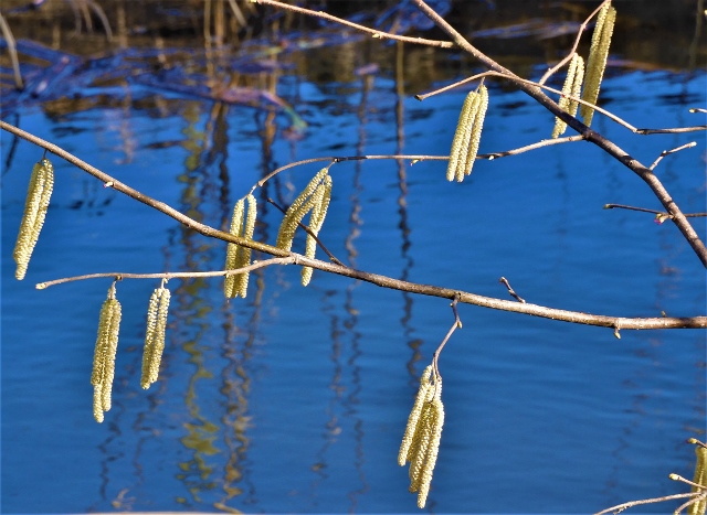 Jag spejar efter växtlighet på marken, inga blåsippor mellan ekarna eller tussilago i lerhögarna, det är ännu kallt i marken kring ån, hasseln och alen är de enda som solen har väckt.
