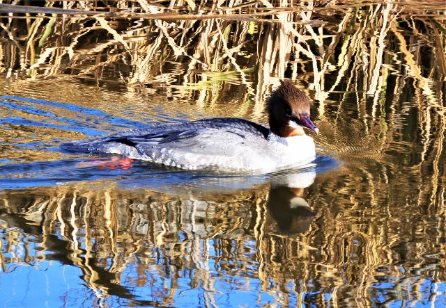 Och i ån simmar några fåglar jag inte sett så nära förut. De skyndar sig och när jag kommer närmare dyker de och är borta men kommer upp en bra bit därifrån.