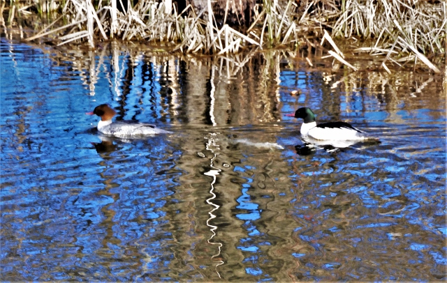 Och i ån simmar några fåglar jag inte sett så nära förut. De skyndar sig och när jag kommer närmare dyker de och är borta men kommer upp en bra bit därifrån.