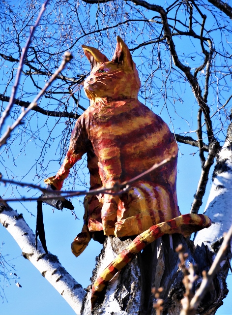 I en avbruten björk sitter en randig katt och håller utkik. Konsten utmed ån som skapats av namnlösa konstnärer mår dåligt av det skiftande vädret och lever olika länge.