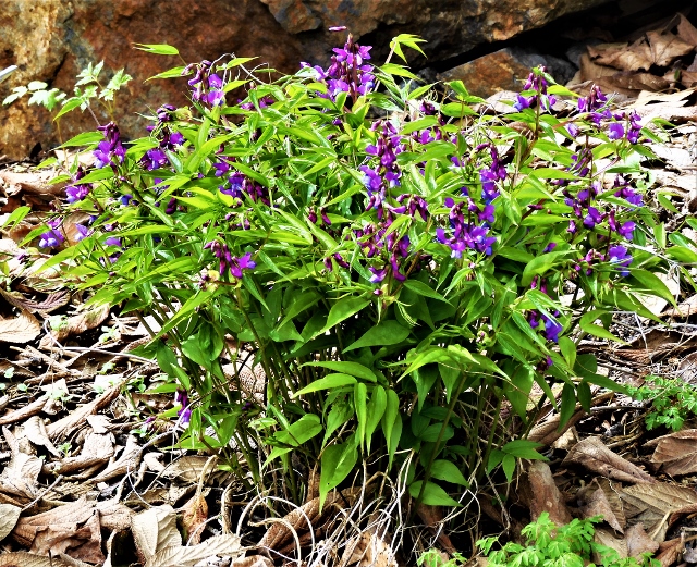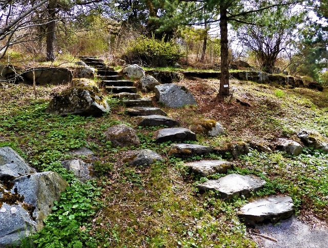 Stentrappor mot fjälltoppen från flera håll utmed bergssidorna, de syns bäst innan löv och annat grönt växt ut och skymmer sikten mellan stenblocken. Jag fascineras av hela fjällbygget och önskar att någon ville göra en karta över alla trappor och planteringar. Allt byggdes för hand med hästar som transporthjälp och växter finns planterade överallt, så det är inte bara en planlös sophög, det är en klippträdgård att upptäcka.