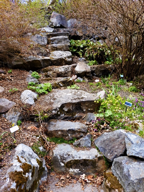 Stentrappor mot fjälltoppen från flera håll utmed bergssidorna, de syns bäst innan löv och annat grönt växt ut och skymmer sikten mellan stenblocken. Jag fascineras av hela fjällbygget och önskar att någon ville göra en karta över alla trappor och planteringar. Allt byggdes för hand med hästar som transporthjälp och växter finns planterade överallt, så det är inte bara en planlös sophög, det är en klippträdgård att upptäcka.