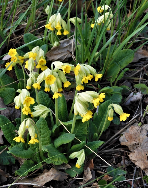 man har rensat marken så att vitsippor och gullvivor börjar synas och breda ut sig.