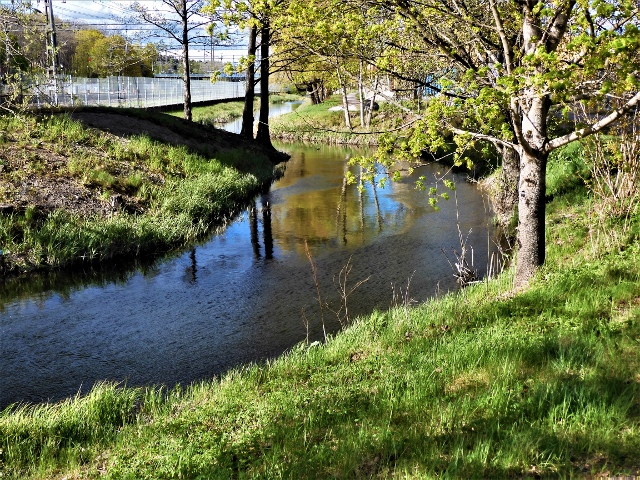 Den här svängen som ån gör under Mälarvägsbron visar alltid något nytt i färg eller som spegel.