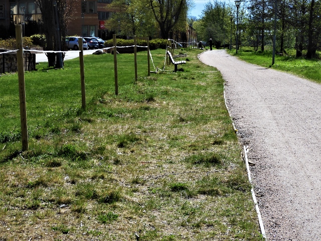 Den långa ”blomsterängen” som man försöker locka flygande insekter att besöka, har väl inte varit någon höjdare att beskåda men är nu rensad från torra stjälkar från förra året och man ser ännu inte de envisa tistlarna, ryssgubbarna och nässlorna. Men de är starka och visar sig väl, det kan nog ta några år att med nutida fröpåsar skapa en tilltalande fristad för fjärilar.