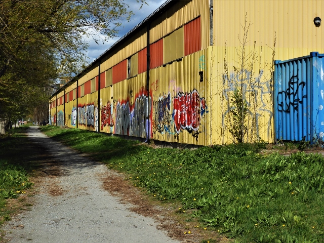 Man får glömma att titta på andra sidan av vägen, vet inte om kommunen har planer på att avlägsna magasinsbyggnaden, den kan knappast vara kvar om man seriöst satsar på en snygg strandpromenad för Väsbys motionärer.