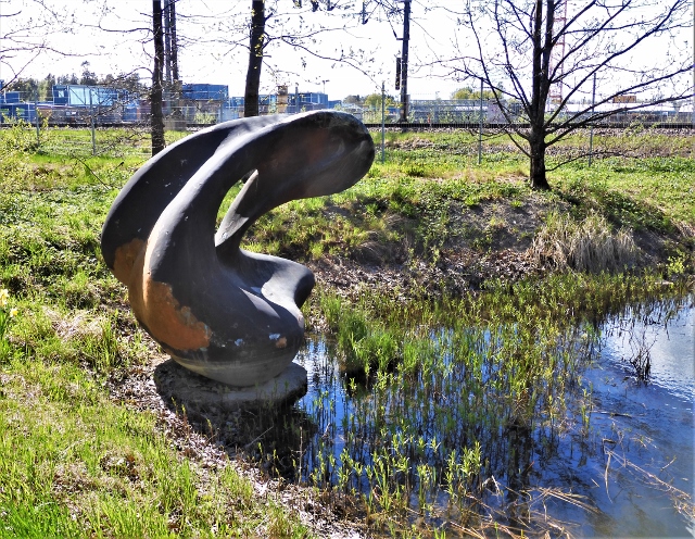 Axel Nordells skulptur står (sitter) bra i gropen, omgivningen förändrar sig , just nu har den vatten kring sig och ytan på figuren varierar från åt till år.