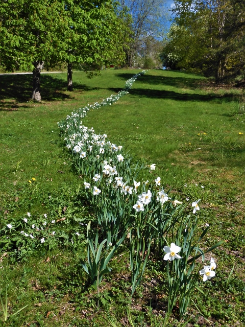 Jag har lämnat ån och vänder hemåt, tar vägen innanför planket på Mälarvägen och där rinner just nu en bäck av pingstliljor.