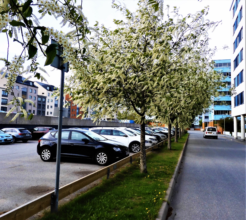 Utmed parkeringen på Dragonvägen blommade en rad träd som liknar hägg men med tre gånger så långa blomklasar som de vilda. Så enormt jämna och vita och med en mildare häggdoft än den vanliga.
