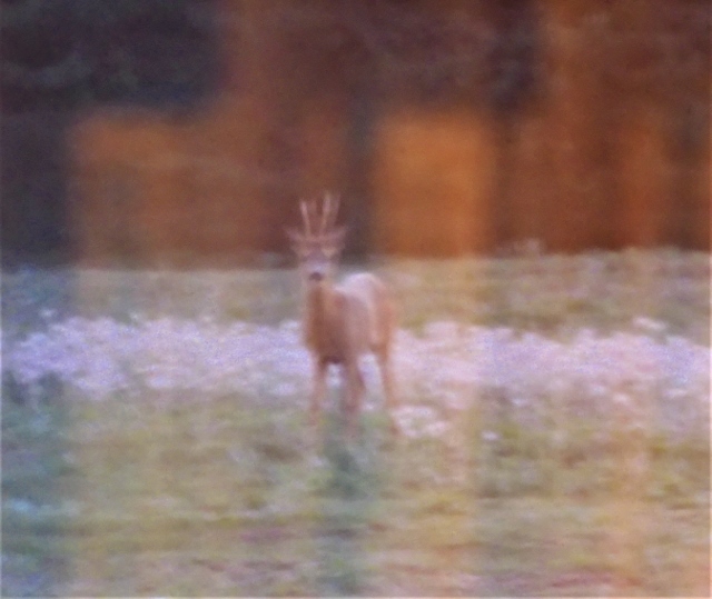 Stängsel har skyddat rosorna mot hungriga rabbisar och rådjur men för syrener och havtorn sträcker sig rådjuren över näten och når att rundbarka. De promenerar i skymningen på fältet framför vårt vardagsrumsfönster och i år kommer tre vuxna djur. De börjar där fältsippornas fröställningar står tätt och där stannar ett av djuren.