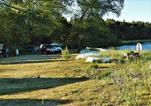 Det är gassigt och varmt och Midsommardag. På förmiddagen gick det att vara ute och jag fyllde en del hål som rabbisarna grävt men sen blev det för hett. När det började svalna mot kvällen ville jag höra vågbrus och då jag numera använder en rollator är det inte lika lätt som förr att nå vattnet. Vid Norebodarna kan man köra bilen ända ut på hamnplanen och där brusar de enorma popplarna och i en bukt fylld med doftande släke frustar vattnet och pulserar som långsamma hjärtslag. Vi har brukat åka dit för att ta avsked när vi varit på Gotland en tid och då är säsongen slut och platsen öde.