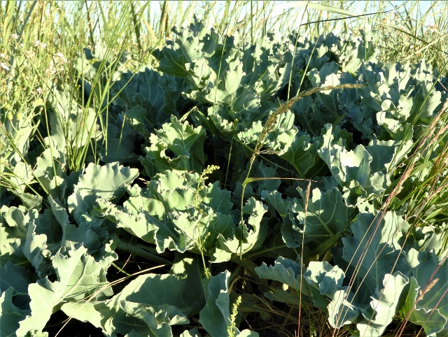 Strandkålen blommar, blommorna är inte så tydliga men en del frökapslar syns.