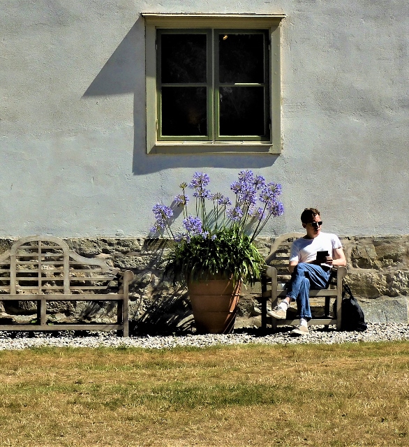 Granne med Vamlingbo kyrka (bakom träden) som i sig är värd ett eget besök ligger den ståtliga prästgården med en park som förr var känd för ett stort och gammalt valnötsträd. Det har nu kompletterats med fikon och olivträd som ser ut att vara planterade direkt i jorden och med lavendel i varierande färgskiftningar kring, som nu blommar för fullt och det brummar av tusen humlor i det blå.