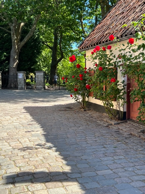 Parkerade bilen utanför kruttornet, vågade inte åka på förbudsskyltade gator fram till parkeringen vid trädgården. Det blev en knöglig sträcka med rollatorn över gatstenarna förbi de rosklädda husen på Strandgatan och där porten till DBW:s trädgård lockade.