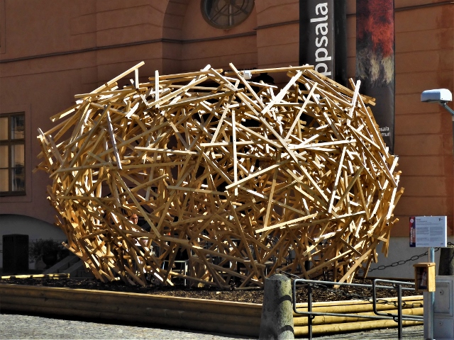 Framför ingången ligger ett konstverk, en ordnad samling vedträn. Jan-Erik Anderssons The Nest, inspirerat av ett fågelbo och med sittplatser inuti.
