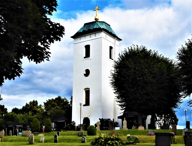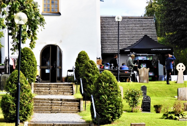 Nyfiken på allt ovanligt gick jag ner till stora parkeringen men där fanns ingen att fråga, all aktivitet pågick kring kyrkans ingång och möblemang och rekvisita fanns innanför den äldre kyrkogårdsmuren.