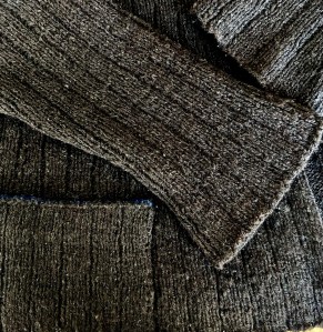 Märkligt – jag hittade inte de svarta långa där jag lagt dem. Nu började ett nytt letande efter ett svart plagg, den här gången visste jag bestämt att jag inte glömt det hos någon, det måste finnas i lägenheten. Allt upprepades jag gick igenom alla hyllorna och kände på de svarta textilierna, silke känns i handen och skiljer sig från allt grövre stickat. För tre dagar sedan, när jag ännu en gång tittade igenom hyllorna , låg fullt synligt på hyllan i axelhöjd ett svart ihoppressat knyte inklämt mellan väggen och trådkorgen och när jag drog i det såg jag grövre maskor. Jag höll andan och – det var koftan jag så länge letat efter och där satt också broschen !! Jag blev obeskrivligt glad. Trådkorgen innehöll skärp och bälten och koftan var hårt ihopklämd till en knöl inte större än ett måttligt blomkålshuvud, kan den verkligen ha legat där hela tiden?