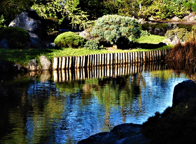 Det är soligt, blåsigt och känns kallt, på med mössan. Japanska dammen syns på långt håll och vattenytan är plötsligt ren och speglar öns grönska. Sedan går jag strandpromenaden utmed berget, förbi ormbunkslandet och grottorna.