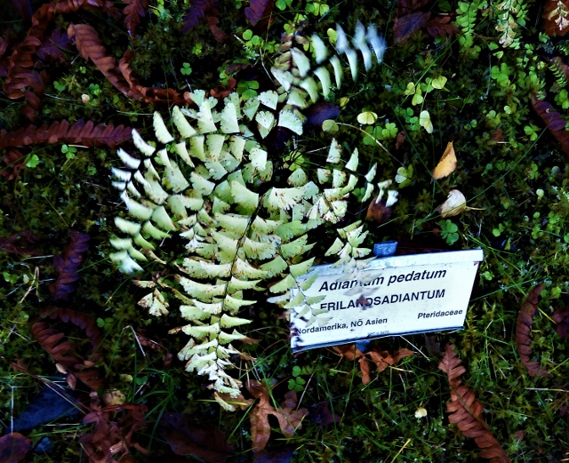 Nere på marken bland de många ormbunkarna lyser små nya plantor av frilandsAdiantum som nattkylan avfärgat så de ser vita ut.