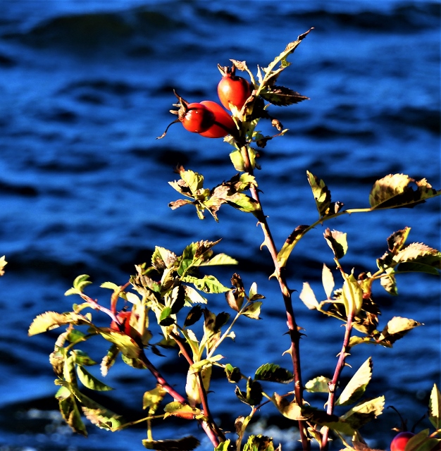 Sjösidan av gångvägen kantas av nyponrossnår.