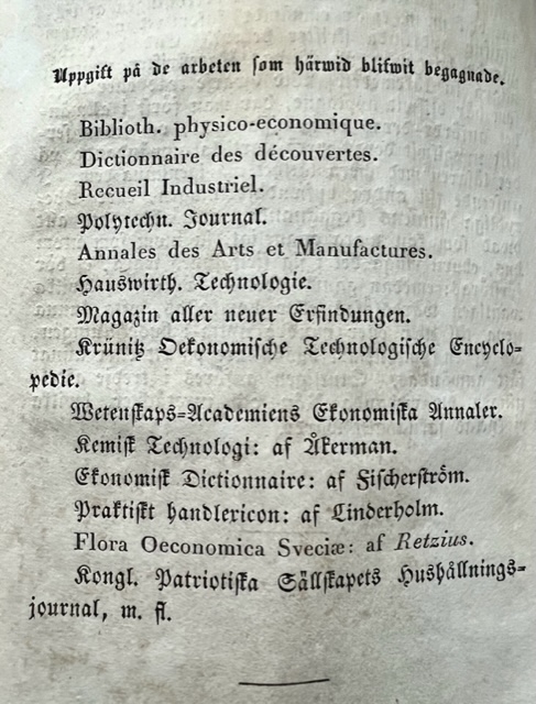Färgning med inhemska wexter, på ylle, bomull och linne jämte underrättelse om beredningen av några till hushållsfärgning tjenliga blåkypar, samt sättet att färga turkiskt rött och äkta violett på bomull och linne. Bok tryckt 1842.
