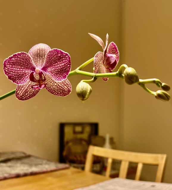 Hemma i köket har orkidén från i somras som Karin satte i mitt fönster skickat ut en ny rad med knoppar som började öppna sig på julafton och var tredje dag slår en ny knopp ut. Roligt när en orkidé vill blomma om i vår torra luft. Jag ser det som en första god fortsättning.