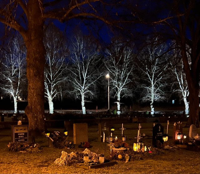 Igår, nyårsdagen måste Lasse få lite ljus och vid halv fyra for jag till Eds kyrkogård. Det hade hunnit bli helmörkt, ingen bil på parkeringen, små ljuslågor fladdrade på gravarna och träden utmed stora vägen var upplysta, det var ståtligt.