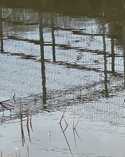 och speglingen av stängslet kring järnvägsrälsen följer med så länge ån och tågen går riktigt nära varandra. När de sedan skiljs åt och gångvägen följer ån, är tågen ändå nära och man både ser och hör när de dånar förbi tätare än var tionde minut.