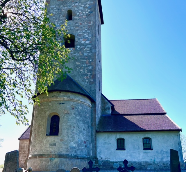 Skånela kyrka beskrivs som en av Upplands fyra östtornskyrkor, de övriga är Norrsunda, HusbyÄrlinghundra och Färentuna kyrkor. När vi rundar byggnaderna säger vi båda att det känns lite som Italien. Kyrkan är från 1160-talet och arkitekten tros vara en tysk från byggnadshyttan vid Lunds domkyrka, den har tillbyggts i olika omgångar, brunnit och vitkalkats och kalken avlägsnats så att kalkmålningar åter kan ses.