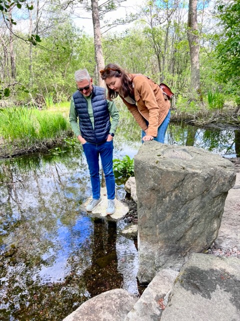 Gösta och Selina kollar flödet. Det korsar vindens krusning och ger den tätrynkade vattenytan.