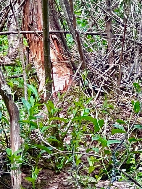 I den sumpiga omgivningen vid Hammarby källa, skymtade jag på håll en vit bit trädstam. Ett lysande ljust avbrott i knähöjd på en mörk trädstam brukar betyda närvaro av bäver, åtminstone när vatten är inom räckhåll.