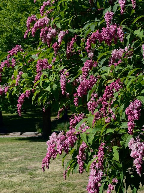 Går till affären, mjölken är slut och sneddar en liten omväg upp genom Suseboparken för att kolla vad som hunnit slå ut sedan sist. En syrensläkting jag inte sett förut med hängande ljuslila klasar håller på eller har slagit ut.