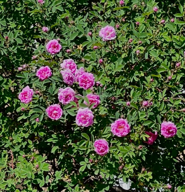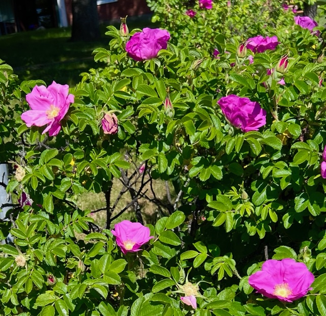 Och lite längre bort utmed gatan har de stora saftiga nyponens rosor slagit ut. Hoppas att ett regn ska fukta rötterna på allt som visat upp sig så fantastiskt den här försommaren. Och jag knallar hem till tomatplantorna och funderar över hur klokt det är att driva upp så törstiga växter.