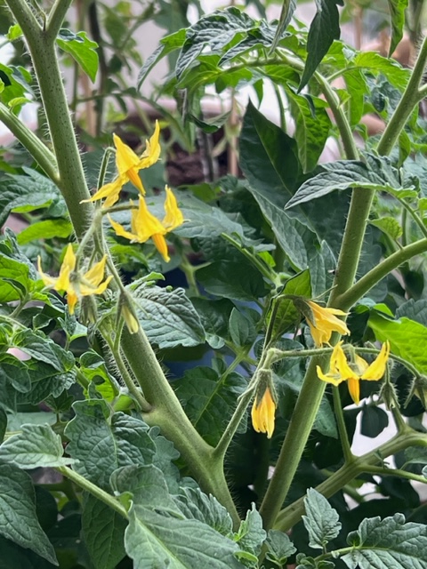 Tomatplantorna, de som ändå blev för många, blommar nu och har tillväxt i omfång och höjd och täcker helt tre sidor av balkongen så att jag måste resa mig upp för att se och vinka till grannen. De dricker stora mängder vatten och har inget tålamod, kroknar genast om man dröjer med vattnet.