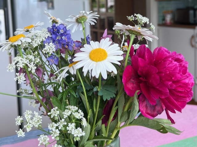 Allt blommar, grannen åt andra hållet ringde på dörren och gav mig en midsommarbukett av pion, Jakobs stege, akvileja och fänrikshjärta, prästkragar och hundloka, den lyser upp hela rummet.