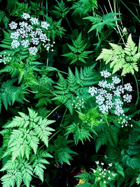Flockblomstrig utan tvärsäkert namn spred ett spetsmönster under träden.