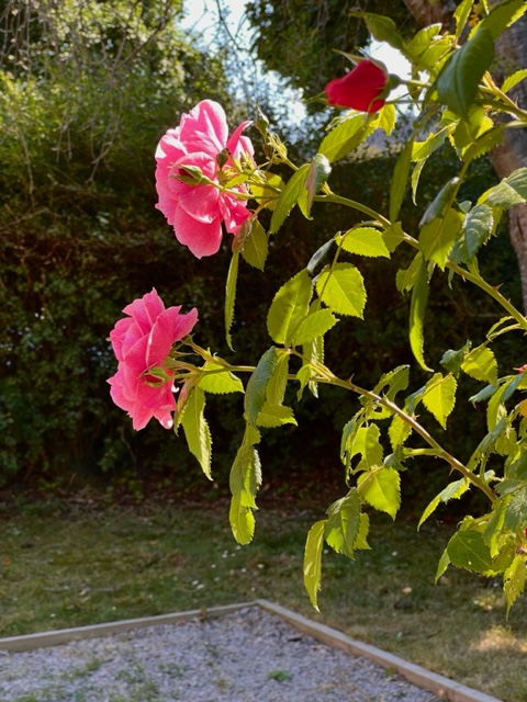 Rosengården med låga rabattrosor har råkat ut för steklar som ätit både grentoppar och rosknoppar i år, därför flammar de inte som vanligt ovanför det blå havet av lavendel och nepeta och hoppet står nu till andra blomningen något senare i sommar. Men bågen i slutet av rabatterna (eller början) är klädd med en frisk klätterros, Rosa Camelot, den har också blommor man vill ha nära.