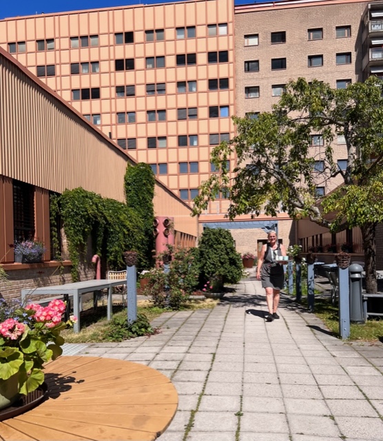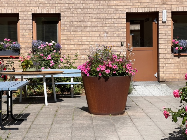 Karin sköter växterna, vattnar och planterar nya när något vissnar och ser till att det alltid är inspirerande att gå ut i trädgården med sitt lunchpaket eller sin kaffekopp och påfyllas av det blommande livet.. Det har konstaterats att personal som haft tillfälle att ta en rast i en trädgård, lättare klarar stress och går inte så ofta ”in i väggen”.